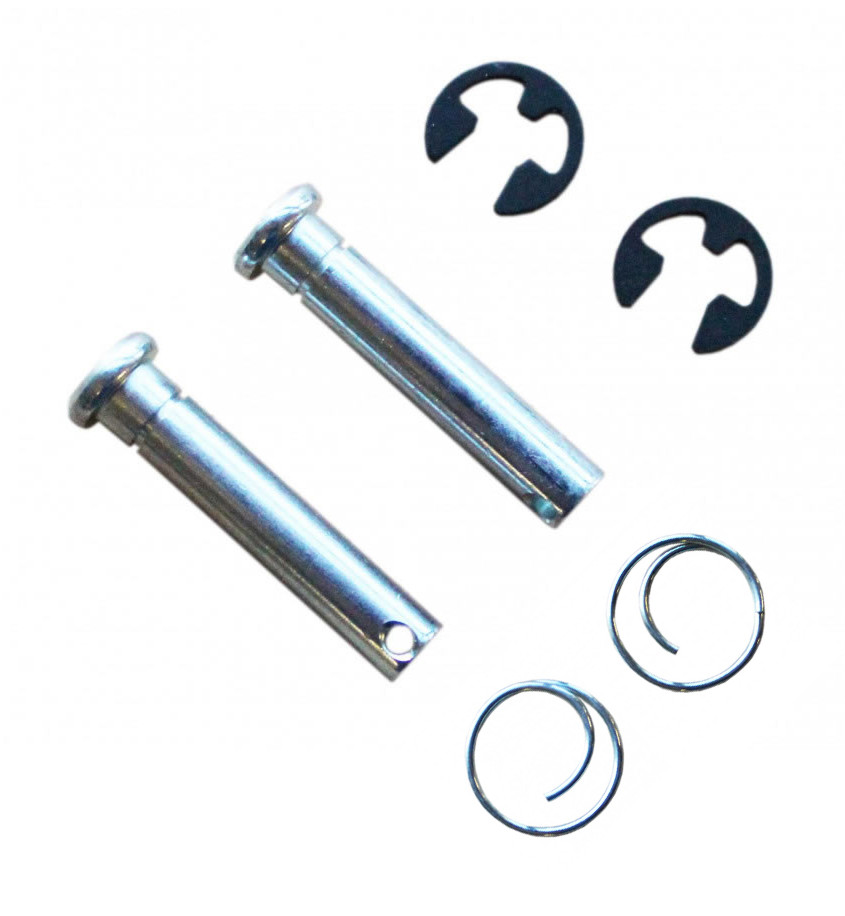 Set of 2 pivot pins, E-clips, and circular-cotters. These pivot pins are installed on the pivot bracket and serve as the pivot point for the Softopper® frame. The E-clips and circular-cotters are required to securely hold the pivot pins in place.