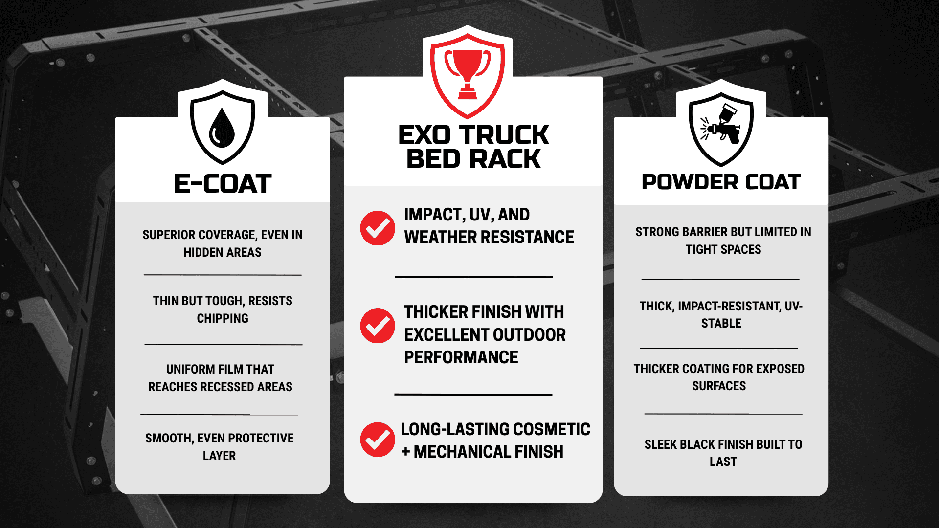 The Softopper Exo Truck Bed Rack® is built to go the distance—and that starts with its finish. Every rack is protected with a dual-layer coating system: first an E-coat primer for complete inside-and-out corrosion protection, followed by a powder coat top layer for maximum durability, weather resistance, and a sleek finish. Both processes are industry leaders on their own, but together they create a finish that’s tougher, longer-lasting, and ready for anything.